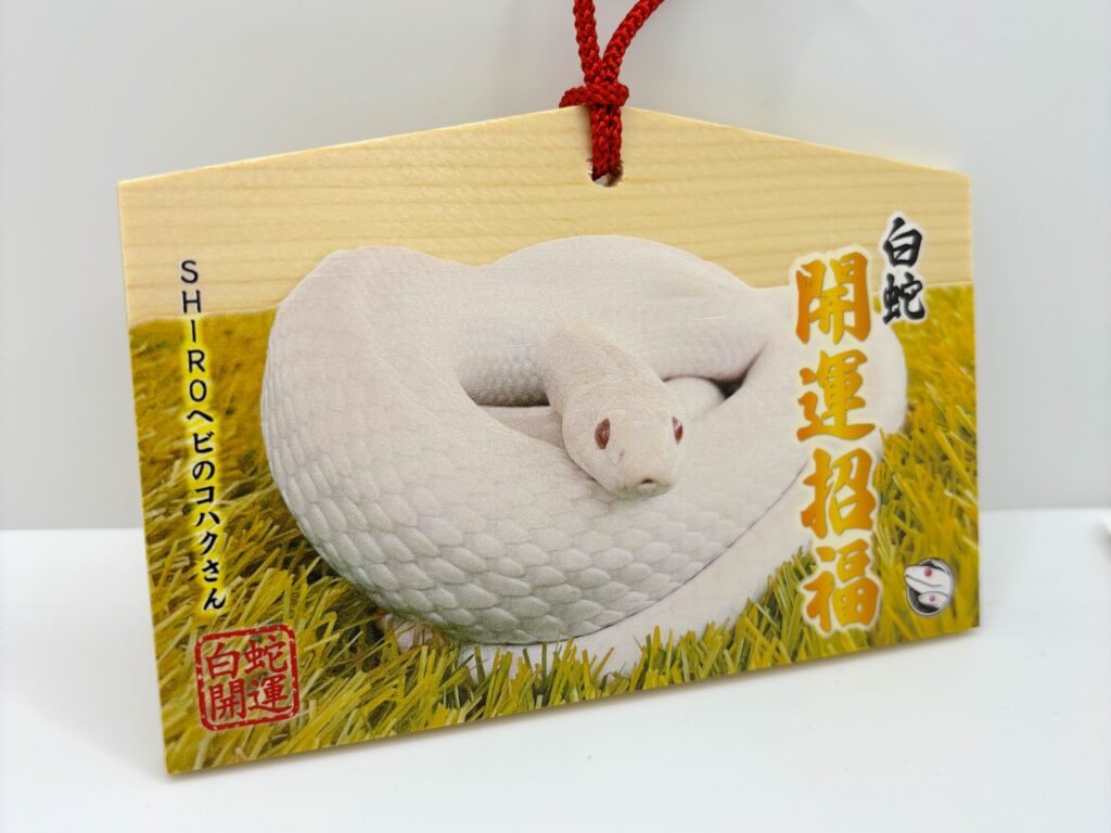 願い事の成就や感謝を祈るための絵馬。縁起の良い白蛇のコハクさんと開運招福を願ったものです。正月、巳の日、願い事がある時、受験前、目標ができた時など1年を通してご祈願に使用できます。